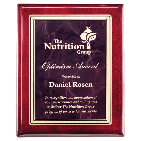 This beautiful high gloss piano finish rosewood plaque features a Ruby marble brass plated steel plate with a gold Florentine design. Personalized to create a unique award, this elegant plaque is a perfect recognition of excellence and achievement.